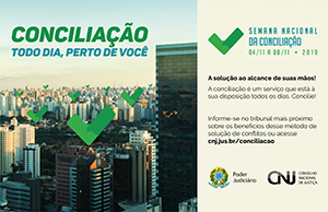 Semana Nacional da ConciliaçãoConciliação, todo dia perto de você” é o slogan deste ano da 14ª Semana Nacional de Conciliação promovida pelo Conselho Nacional de Justiça (CNJ) entre os dias 4 e 8 de novembro. O Tribunal Regional do Trabalho da 18ª Região (Goiás) participa do evento, que é realizado anualmente desde 2006, e envolve os Tribunais de Justiça estaduais, os Tribunais do Trabalho e os Tribunais Federais.