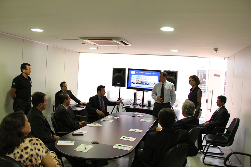 Os visitantes conheceram as diversas áreas de atuação do sistema de segurança, que foram apresentadas por membros da equipe, com exibição de vídeo e data-show, na sala de treinamento da Escola Judicial.