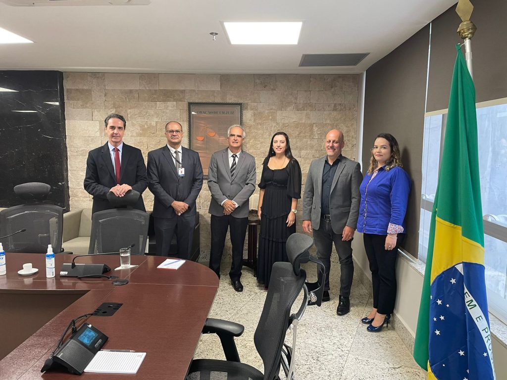 Equipe do TRT-18, integrada pelo secretário-geral da Presidência, Humberto Ayres, secretário-geral Judiciário, Cleber Pires e o juiz César Silveira (juiz de cooperação) acertaram os detalhes da parceria em reunião com a juíza auxiliar da Presidência do TJ-GO, Sirley Costa, o juiz Aldo Sabino (juiz de cooperação) e a servidora Suzana Araújo, da TI