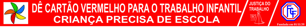 FEDERAÇÃO GOIANA DE FUTEBOL siteO TRT de Goiás, juntamente com outras instituições públicas que integram o Sistema de Justiça, está lançando campanha voltada ao combate do trabalho infantil com o tema “DÊ CARTÃO VERMELHO PARA O TRABALHO INFANTIL, CRIANÇA PRECISA DE ESCOLA”. Para dar maior visibilidade à campanha o Tribunal preparou uma faixa que será mostrada no campo do estádio Serra Dourada no próximo domingo, minutos antes de iniciada a partida entre o Goiás e o Atlético, prevista para as 16 horas.