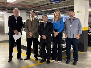 Da esquerda para a direita: servidor Daniel Rocha Júnior; diretor-geral do TRT-GO, Álvaro Resende; Jales Benevides, Deuba Assunção e servidor Ivandenberg Durães. O veículo doado já estava na garagem do tribunal e pronto para entrega