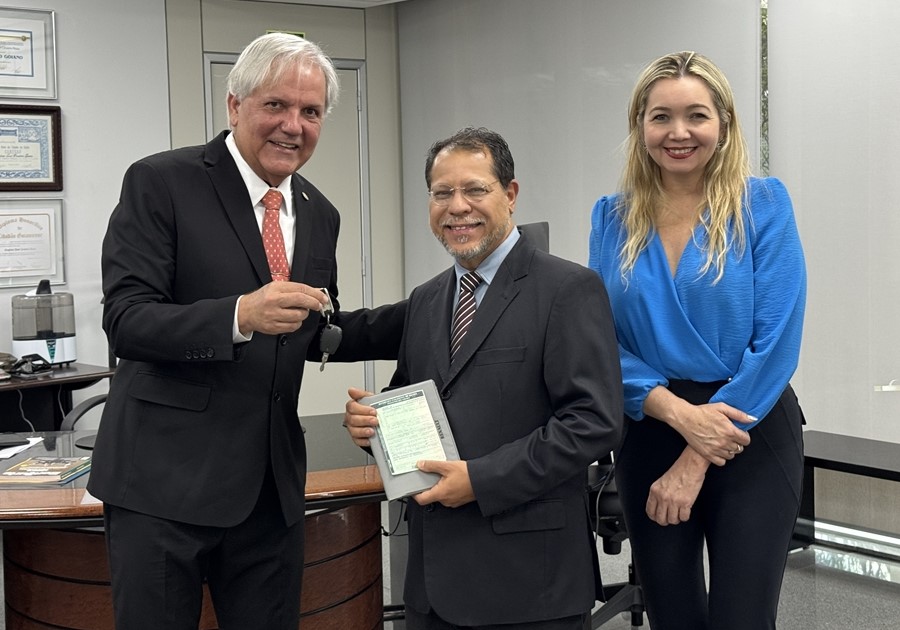 O Tribunal Regional do Trabalho da 18ª Região (TRT-GO) doou um veículo Renault Logan branco, ano 2010/2011, ao Araújo Jorge – Hospital de Câncer na tarde desta quinta-feira, 4/9. A entrega do veículo foi feita pelo presidente do tribunal, desembargador Eugênio Cesário, ao médico cirurgião-oncológico e diretor de Relações Institucionais do Araújo Jorge, Jales Benevides, e à gerente de Relações Institucionais do hospital, Deuba Assunção, no Gabinete da Presidência do TRT-GO.
