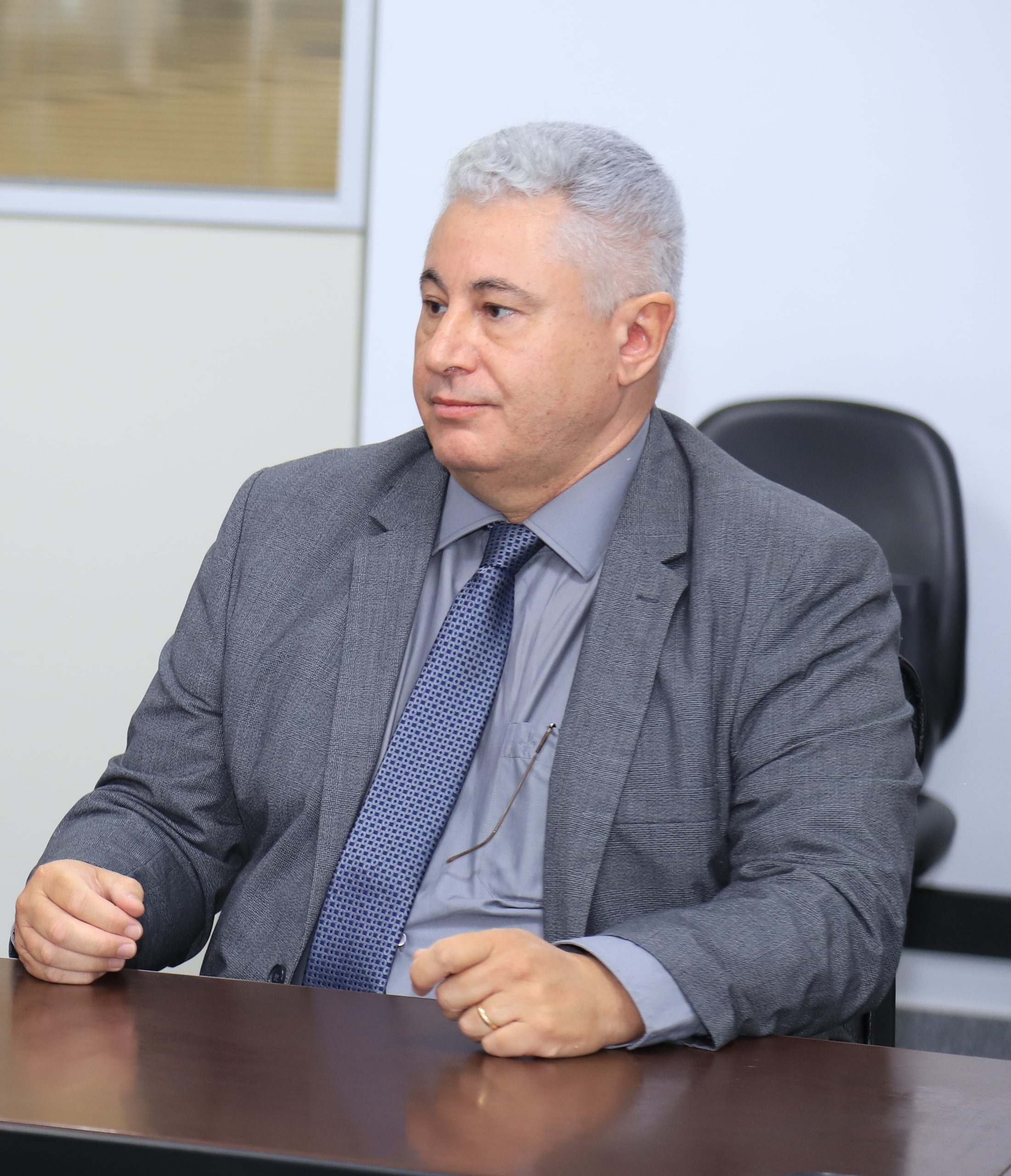 Homem de cabelos grisalhos, terno cinza e gravata azul, sentado à mesa em ambiente formal, com expressão atenta.