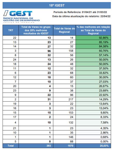 Cinquenta por cento das Varas do Trabalho do TRT-18 estão entre as melhores do país no Índice Nacional de Gestão do Desempenho (IGest). Ao todo, 24 VTs de Goiás estão entre as mais satisfatórias, integrando o grupo dos 25% melhores resultados, conforme avaliação do IGest. Pelo ranking, a 18ª Região figura em sexto lugar, empatada com o TRT da 24ª Região (MS). A análise foi feita entre abril de 2021 e março de 2022.