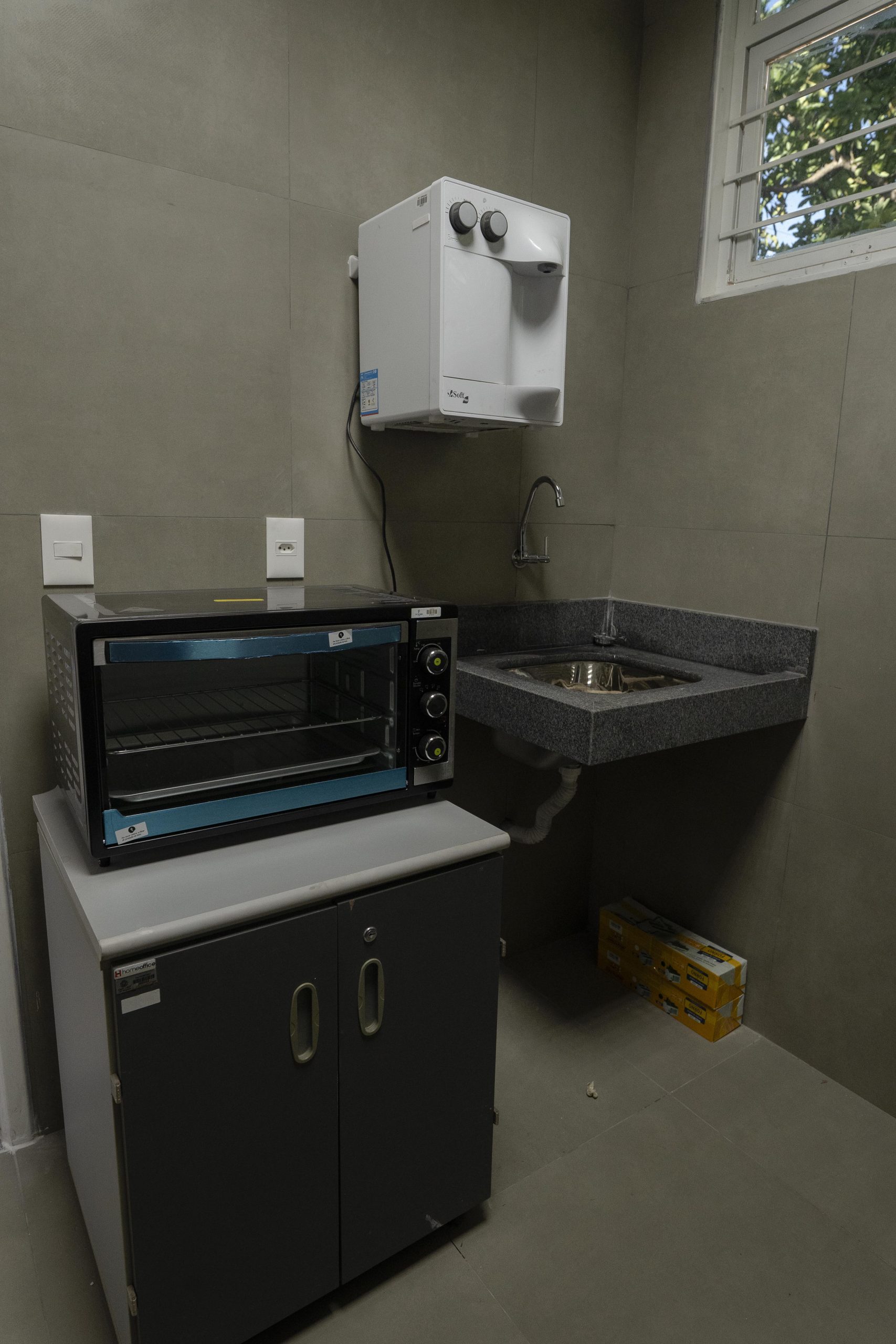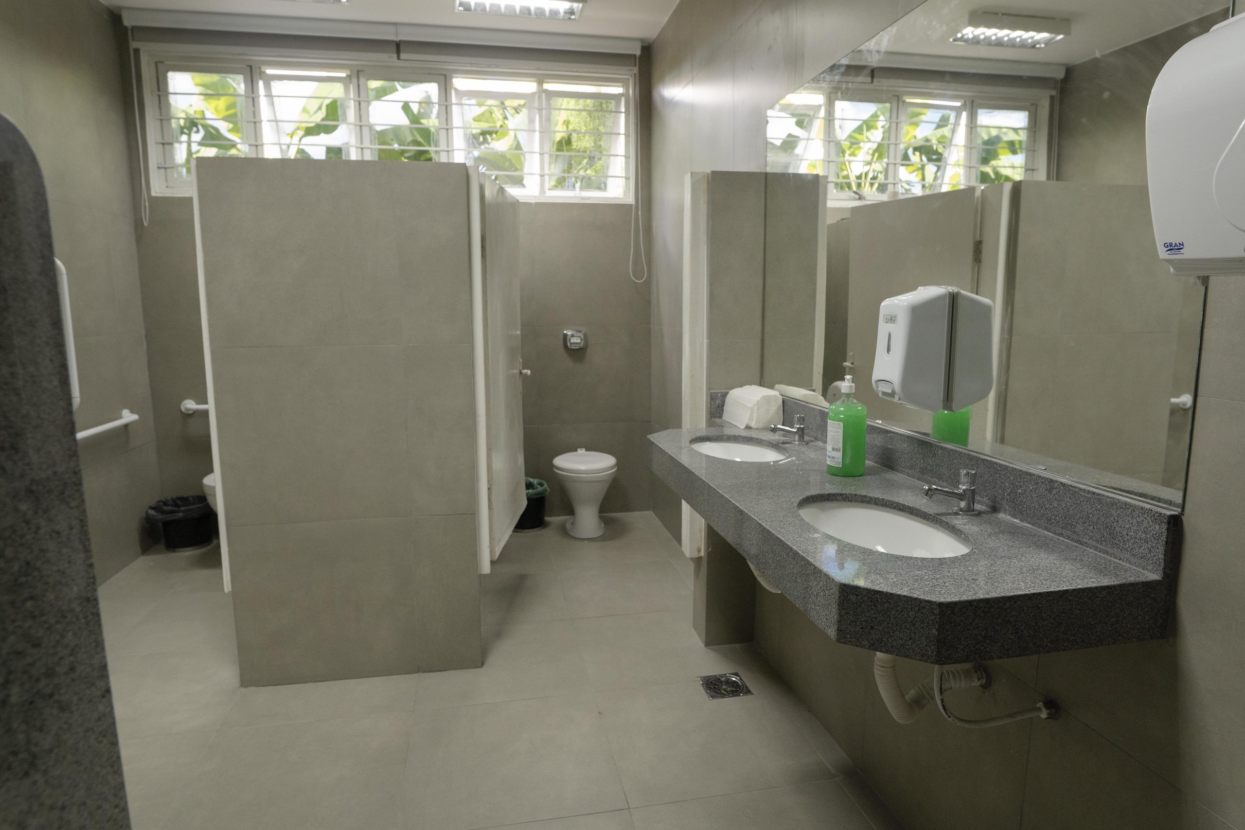 A obra incluiu a reforma das instalações sanitárias, com instalação de bancadas em granito e novos revestimentos. O piso de cerâmica foi substituído por porcelanato, material de maior durabilidade e resistência, que oferece acabamento superior, facilita a limpeza e reduz os custos de manutenção ao longo do tempo. As luminárias antigas deram lugar a lâmpadas de LED, solução mais econômica e sustentável, com consumo de energia até 80% menor em relação a modelos tradicionais.