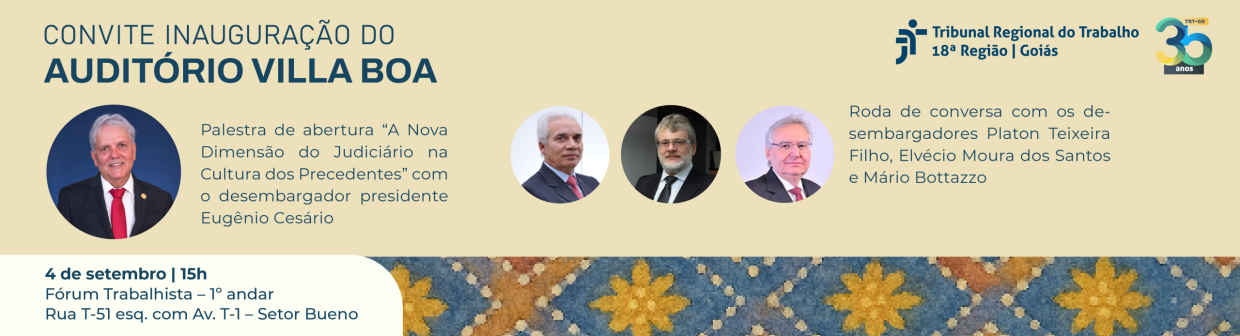 O Tribunal Regional do Trabalho de Goiás (TRT-GO) inaugura nesta quinta-feira (4/9), às 15 horas, as novas instalações do Auditório Villa Boa, após uma ampla reforma. Fechado para obras desde janeiro, o auditório, localizado no Complexo Trabalhista de Goiânia, foi modernizado e agora oferece conforto e tecnologia para o público. Entre as melhorias estão o novo revestimento acústico, a renovação do piso com aplicação de carpete, a instalação de portas corta-fogo com barra antipânico, o aprimoramento da iluminação e a aquisição de equipamentos de multimídia de última geração. O espaço tem capacidade para 263 pessoas.