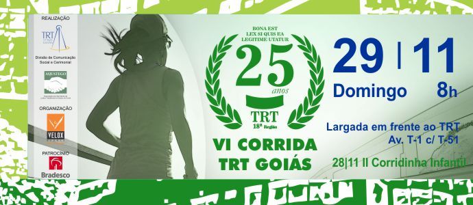 A VI Corrida TRT Goiás acontece neste domingo (29/11), às 8 da manhã, com largada em frente ao Fórum Trabalhista de Goiânia, localizado na Av. T-1, esquina com a Rua T-51, no Setor Bueno. No sábado (28/11) será a vez das crianças participarem da 2ª edição da Corridinha Infantil, com largada no mesmo local às 9 da manhã. O evento deste ano vai comemorar o jubileu de prata do TRT da 18ª Região, instalado no dia 30 de novembro de 1990. Durante o evento, o Tribunal vai manter um posto de arrecadação de água mineral para ajudar as vítimas da tragédia ocorrida na cidade de Mariana (MG), com o rompimento de duas barragens no início do mês de novembro.