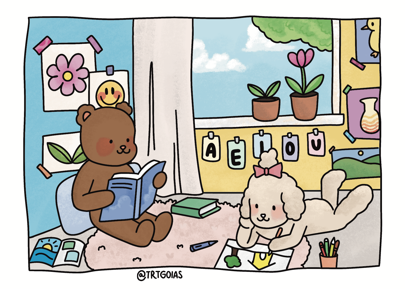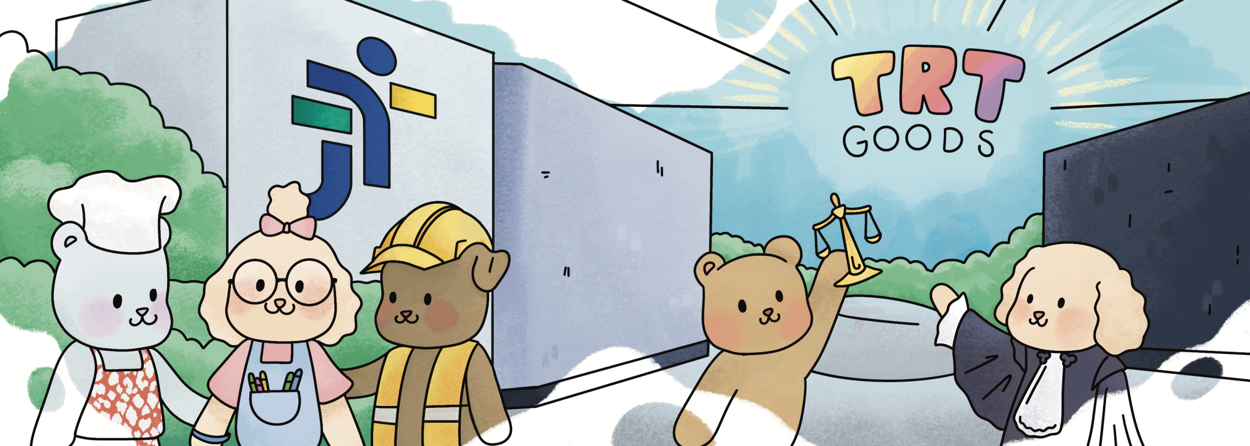 A imagem é uma **ilustração de desenho animado** que mostra dois animais fofos em um cenário aberto: um urso de pelúcia à esquerda, segurando uma balança da justiça dourada, e um cachorro poodle à direita, vestido com uma toga de juiz. Acima, em letras coloridas, está escrito **"TRT GOODS"**. Eles estão em uma estrada que leva à frente, com paredes ou prédios grandes dos lados, e um céu claro com um sol estilizado.O trabalho infantil ainda é uma realidade no Brasil. Segundo o Ministério do Trabalho e Emprego (MTE), com base em dados do IBGE de 2024, houve aumento de 2,1% no número de crianças e adolescentes nessa situação, especialmente entre 5 e 13 anos.