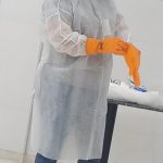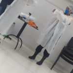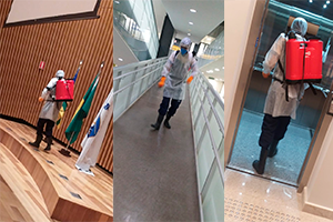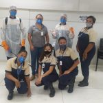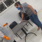 Cinco empregados terceirizados foram capacitados para o serviço e o produto utilizado para a sanitização de ambientes é o quaternário de amônio.