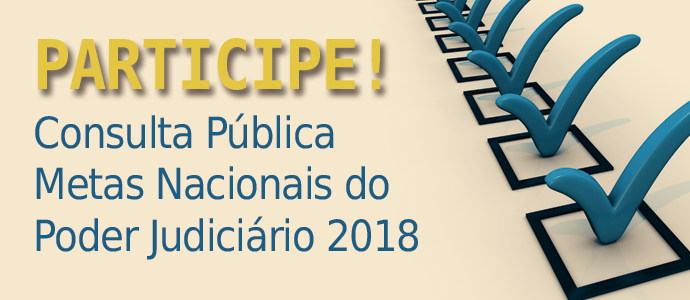 O Tribunal Regional do Trabalho da 18ª Região, em atendimento ao disposto na Resolução CNJ nº 221/2016, que institui princípios de gestão participativa e democrática na elaboração das metas nacionais, abre Consulta Pública para manifestação dos interessados quanto às metas do Poder Judiciário para 2018.