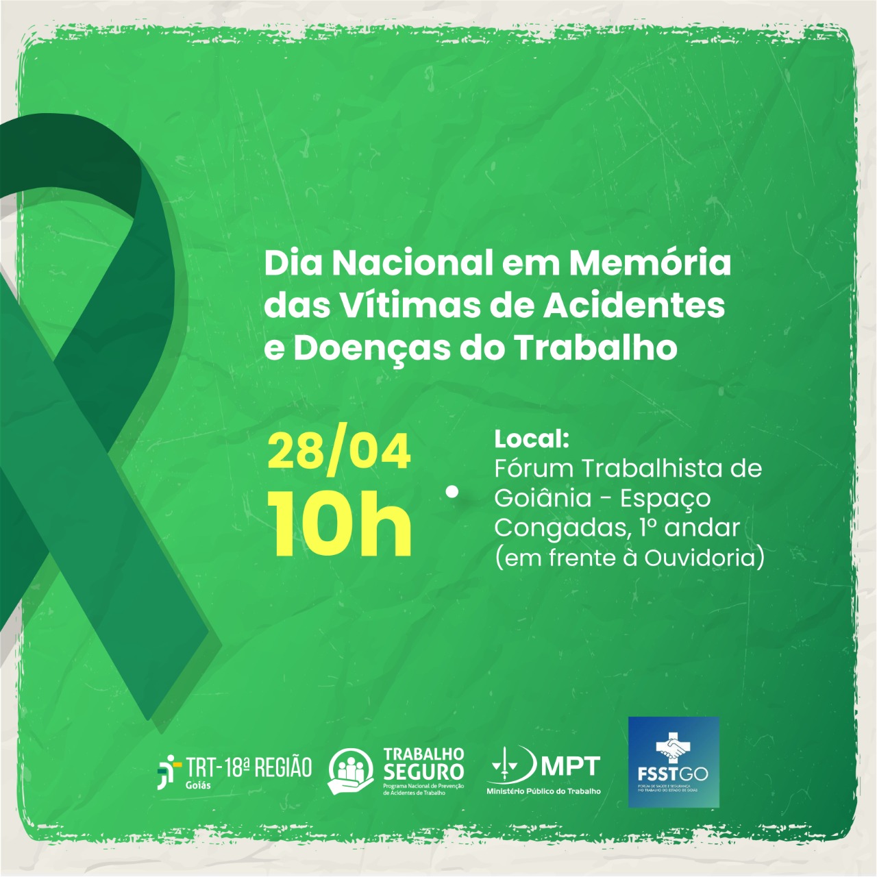 Cartaz de divulgação do Dia Nacional em Memória das Vítimas de Acidentes e Doenças do Trabalho - 28/4 às 10h, local: Fórum Trabalhista de Goiânia - Espaço CongadasO TRT-18 aderiu ao movimento Abril Verde, campanha de âmbito nacional que visa alertar para a importância da prevenção de acidentes laborais. Para chamar a atenção da sociedade sobre o tema, a praça de convivência do Complexo Trabalhista de Goiânia está iluminada em tons de verde. Além disso, o Tribunal realizará evento para lembrar o Dia Nacional em Memória das Vítimas de Acidentes e Doenças do Trabalho nesta quinta-feira (28/4), às 10h,  no Espaço Congadas, 1° andar Fórum Trabalhista de Goiânia (entrada pela Rua T-51, setor Bueno).