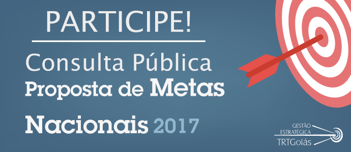Pela primeira vez na história da Justiça do Trabalho, a sociedade e a comunidade jurídica poderão opinar sobre a Proposta de Metas Nacionais sugerida pelo Conselho Superior da Justiça do Trabalho (CSJT) para 2017. Nesse sentido, o TRT de Goiás abriu consulta pública, por meio de formulário eletrônico, para ouvir a opinião de magistrados, servidores da Justiça, advogados, procuradores e a população em geral sobre as metas propostas pelo Conselho.