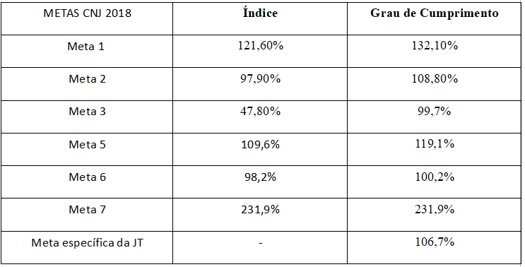 O TRT goiano conseguiu cumprir nos últimos dois anos seis das sete metas do CNJ. Em 2018, apenas a Meta 3, que se refere ao percentual de conciliações, não atingiu os 100%, embora tenha chegado muito perto, com grau de cumprimento de 99,7%. Com relação ao desempenho do Tribunal na fase de execução, em que a Justiça do Trabalho atua para dar cumprimento à sentença e quitar os débitos trabalhistas, o TRT bateu a Meta 5 pela segunda vez consecutiva, mesmo com o aumento do índice de 90 para 92% em 2018. Considerada uma das mais difíceis de serem alcançadas, a Meta 5 foi batida com folga pela 18ª Região, alcançando índice de 109,6% e grau de cumprimento de 119,1%, considerando o percentual estabelecido de 92%.