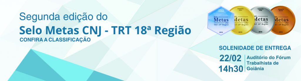 O Tribunal Regional do Trabalho da 18ª Região (Goiás) realiza no dia 22 de fevereiro a segunda edição do Selo Metas CNJ. O evento acontece no auditório do Fórum Trabalhista às 14h30 e premiará as varas do trabalho goianas que tiveram bom desempenho no cumprimento das Metas do Conselho Nacional de Justiça (CNJ) em 2018. As unidades que se destacaram no alcance das metas receberão troféus e certificados do “Selo Metas CNJ 2018 – TRT 18ª Região”.
