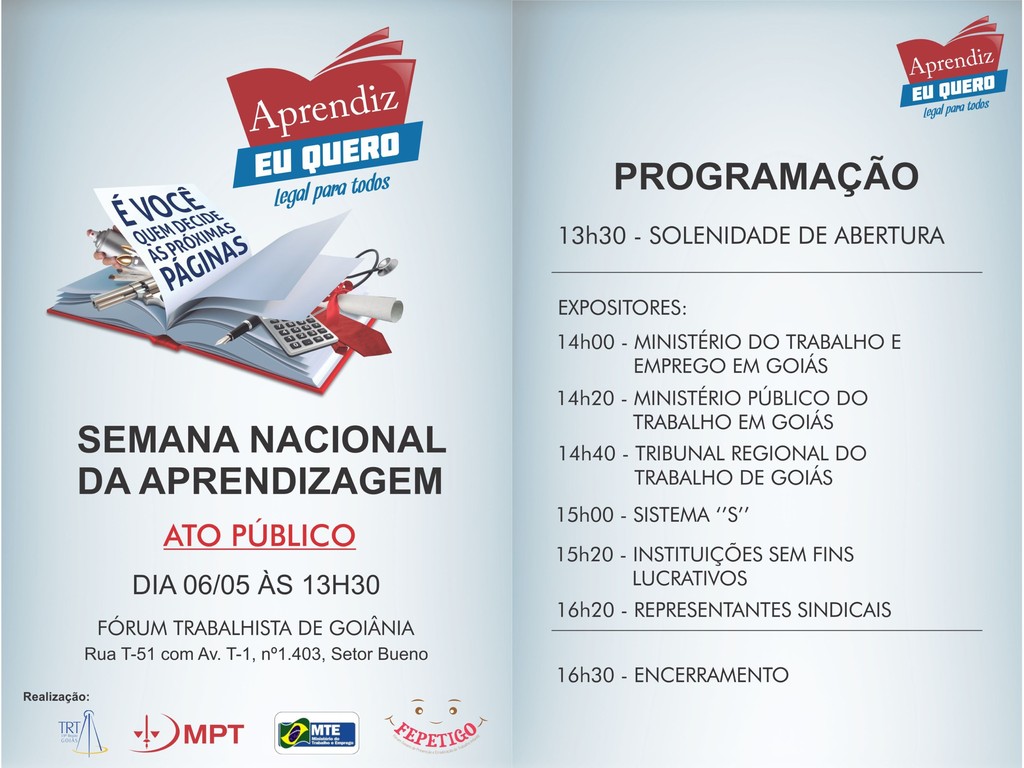 O Tribunal Regional do Trabalho da 18ª Região vai realizar um Ato Público na próxima sexta-feira, dia 6 de maio, das 13h30 às 16h30, no auditório do Fórum Trabalhista de Goiânia, como parte da programação da Semana Nacional da Aprendizagem, iniciativa do Tribunal Superior do Trabalho (TST), Ministério Público do Trabalho (MPT) e Ministério do Trabalho e Previdência Social (MTPS).