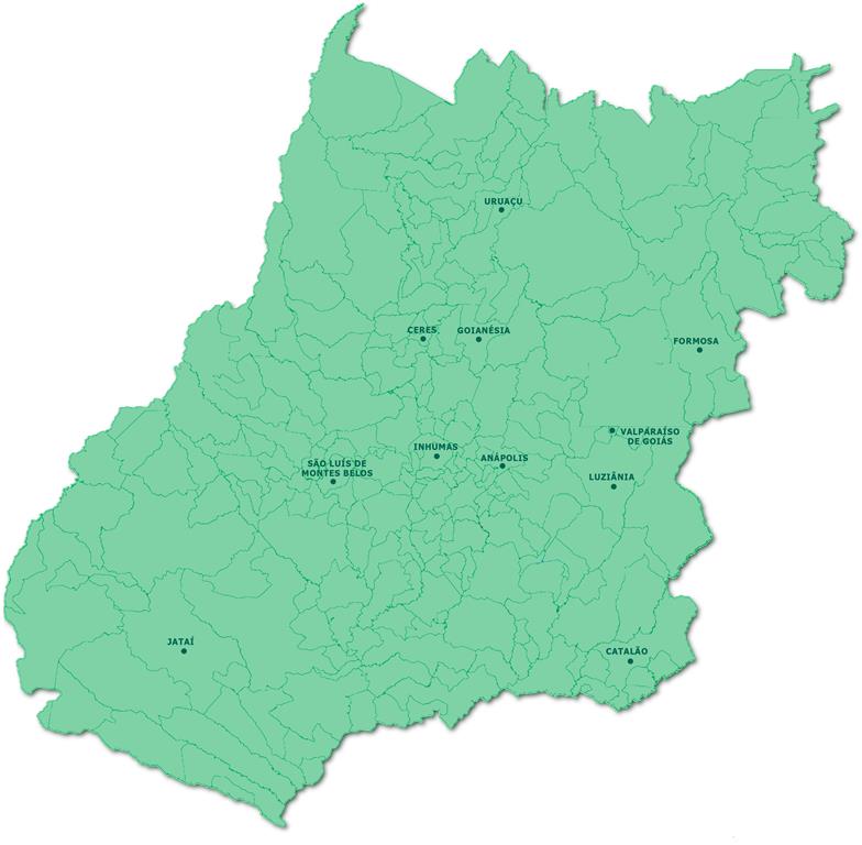 Mapa de Goiás, na cor verde, com as cidades que aderiram ao Cejusc Digital em destaque