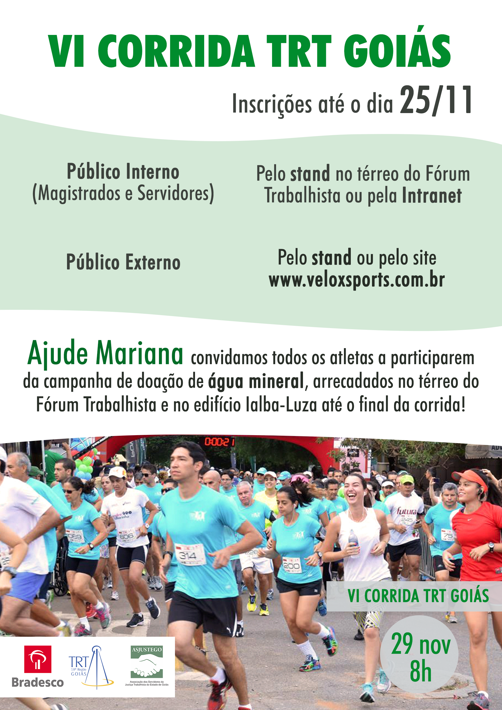Atenção atletas! Não esqueçam de se inscrever na VI Corrida TRT Goiás que será realizada no próximo domingo, dia 29, às 8 da manhã. O evento este ano comemora os 25 anos de instalação do TRT18. Crianças também podem participar da II Corridinha Infantil, no dia 28/11, às 9 horas, que tem como tema o combate ao trabalho infantil.