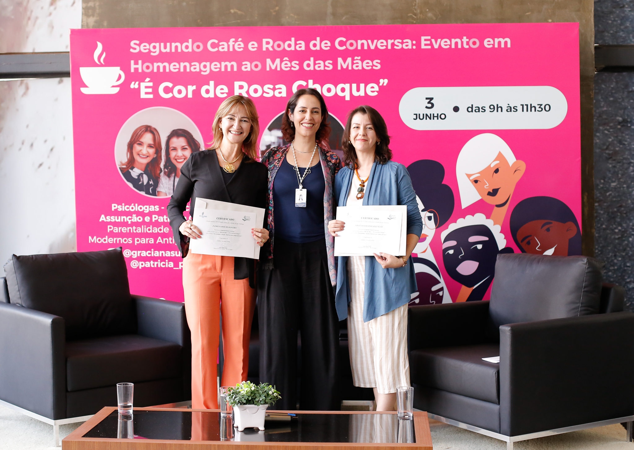 As psicólogas Patrícia Oliveira, Marina Cançado e Graciana Assunção, debatendo sobre os desafios da parentalidade
