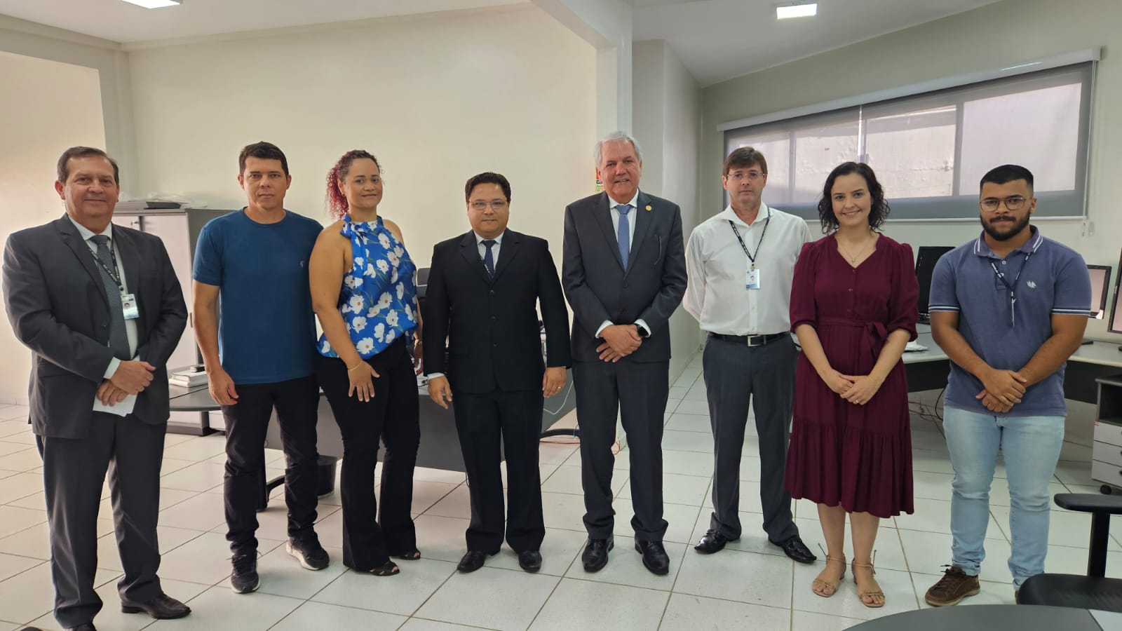 Desembargador Eugênio Cesário e o diretor da Secretaria de Corregedoria Regional, Fábio com o diretor de Secretaria Mário Lúcio Fontoura e a equipe de servidores da VT de Ceres