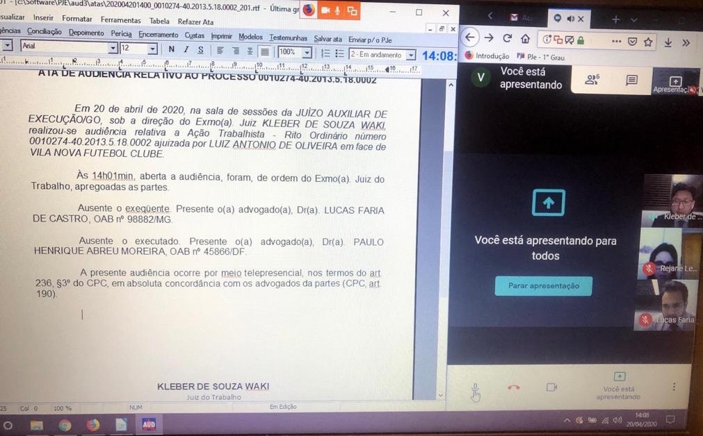 O Juízo Auxiliar de Execução (JAE) realizou 6 audiências de conciliação por videoconferência que resultaram em dois acordos entre o Vila Nova Futebol Clube e dois ex-jogadores da agremiação. Nos processos, em fase de execução, foram negociados R$ 110 mil que serão pagos aos atletas em parcela única. As audiências telepresenciais foram realizadas por meio do aplicativo Google Meet e conduzidas pelo juiz Kleber Waki, com o apoio dos servidores da unidade.