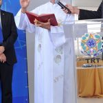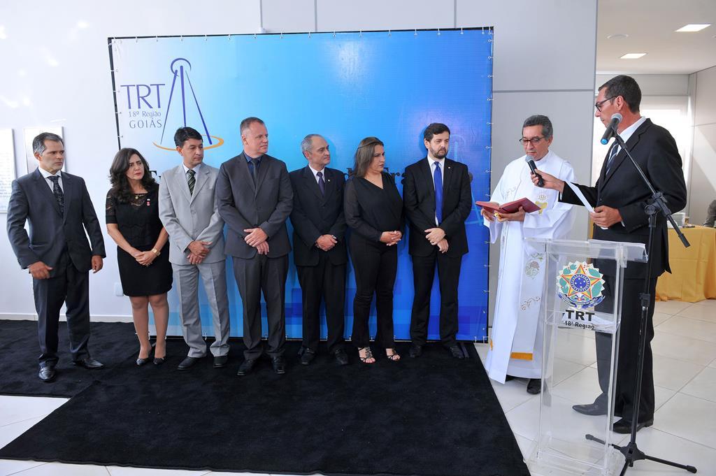 O vigário episcopal Antônio Donizete abençoa a nova sede da VT de Inhumas. Na imagem, o presidente da Amatra, juiz Luciano Crispim; a juíza Alciane Margarida , titular da VT de Inhumas; o desembargador Paulo Pimenta; o vice-presidente, desembargador Breno Medeiros; o prefeito Dioji Ikeda; a secretária-geral da OAB-GO, Delzira Menezes; e o juiz de direito Pedro Corrêa